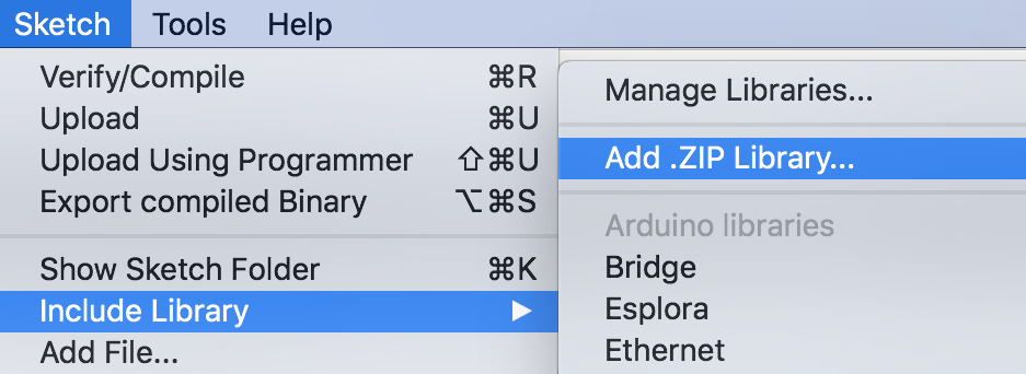 Per aggiungere gli esempi già scritti (così da avere qualcosa da cui partire) vi basterà andare su: Sketch -> Include Library -> Add .ZIP Library...